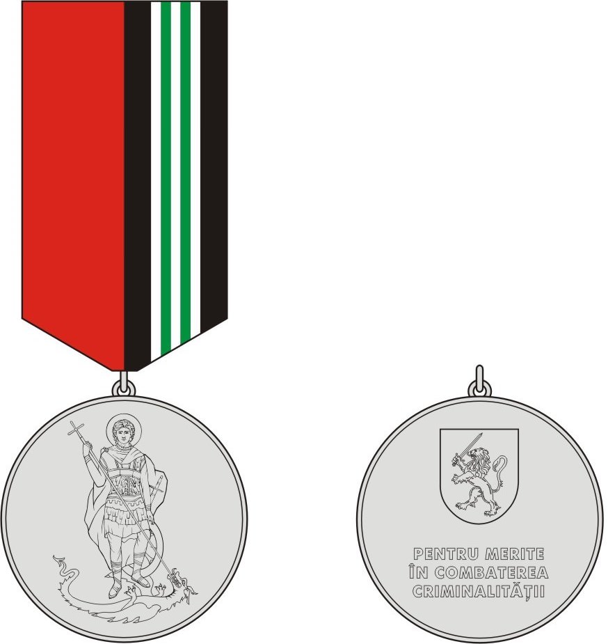 Medalia „Pentru merite în combaterea criminalităţii”, clasa I și clasa II, se conferă prin ordinul șefului Inspectoratului General al Poliției angajaților din cadrul subdiviziunilor IGP, ce obțin rezultate înalte în prevenirea şi combaterea criminalităţii, constatarea şi investigarea infracţiunilor, identificarea persoanelor care le-au comis şi, după caz, a căutării acestora. Totodată, cu această distincție se decorează și alte categorii de persoane pentru aportul considerabil manifestat în domeniul combaterii criminalităţii. | |