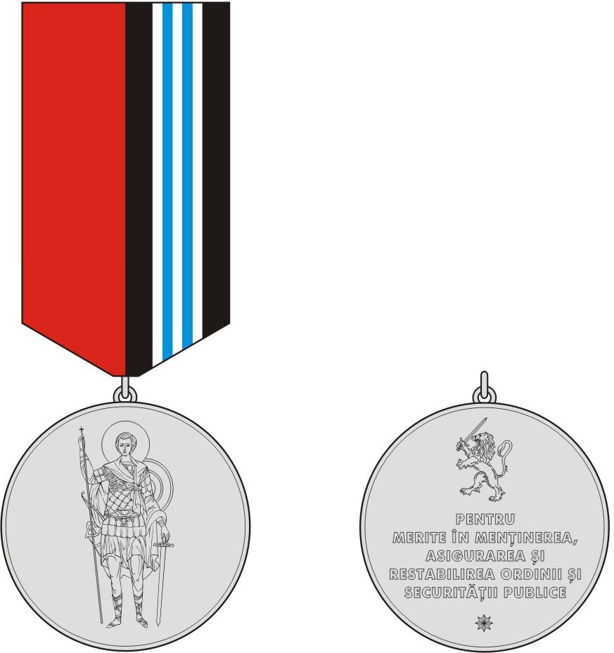 Medalia „Pentru merite în menţinerea, asigurarea şi restabilirea ordinii şi securităţii publice”, clasa I și clasa II, se conferă prin ordinul șefului Inspectoratului General al Poliției angajaților din cadrul subdiviziunilor IGP, pentru obținerea rezultatelor înalte în menţinerea, asigurarea şi restabilirea ordinii şi securităţii publice, asigurarea siguranţei persoanei, prevenirea infracţiunilor şi contravenţiilor, constatarea contravenţiilor şi aplicarea sancţiunilor contravenţionale. Totodată, cu această distincție se decorează și alte categorii de persoane pentru aportul considerabil manifestat în domeniul menţinerii, asigurării şi restabilirii ordinii şi securităţii publice. | |